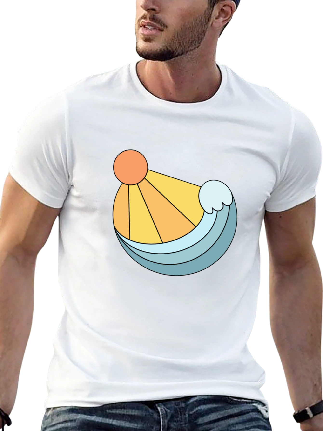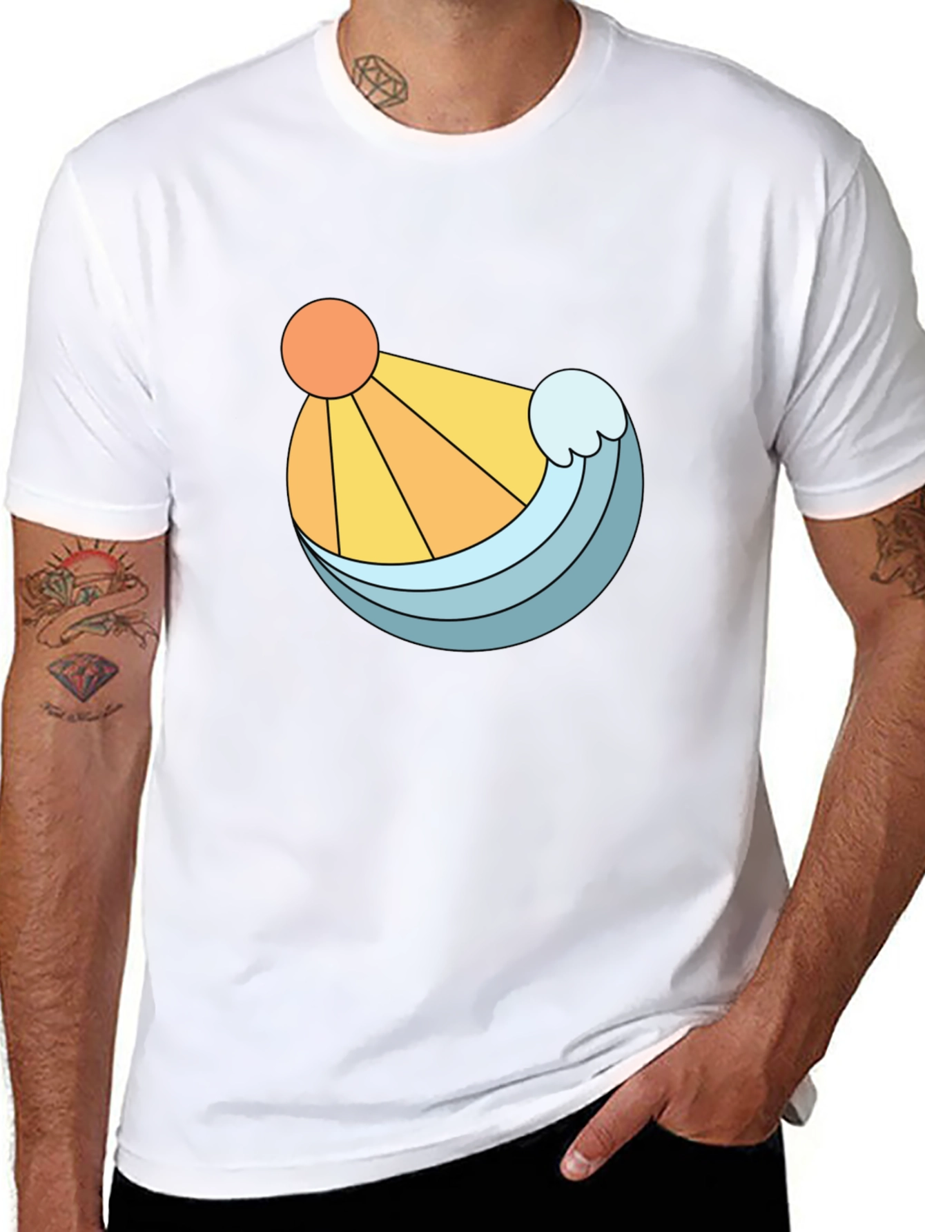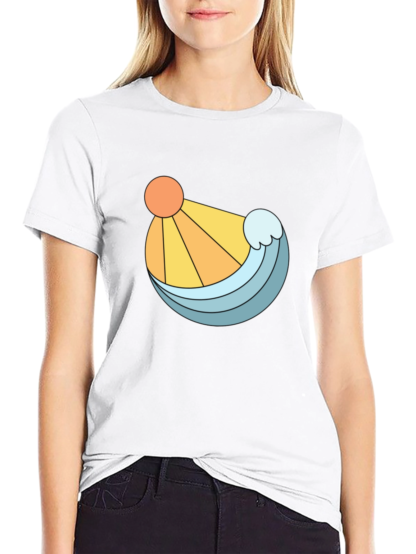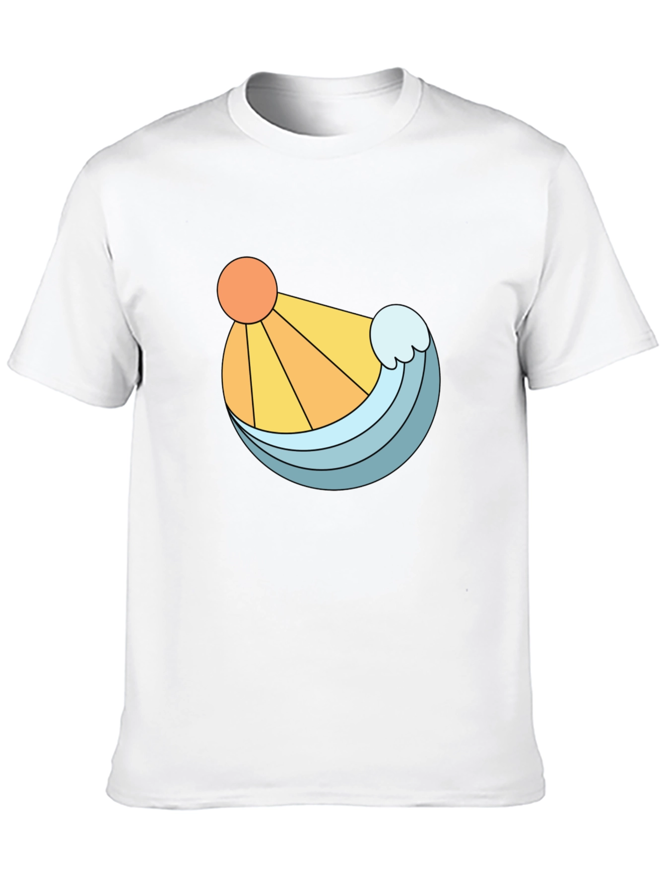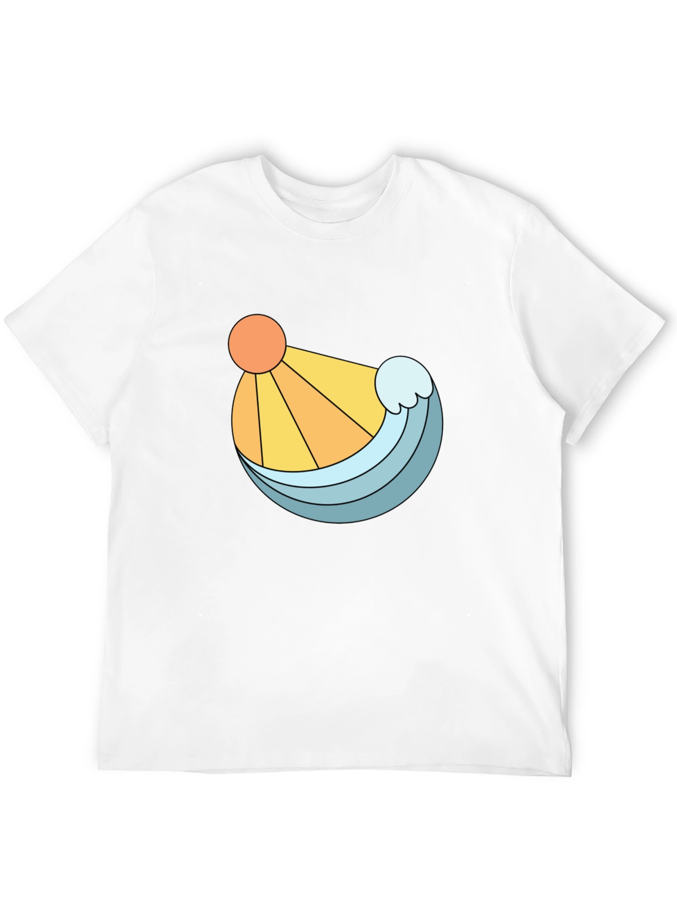 Embrace a sunny, beachy vibe with this stylish black t-shirt. Featuring a unique graphic design of a bright orange sun and a refreshing blue wave, this tee is perfect for adding a pop of color to your casual wardrobe. The clean lines and bold illustration make it a standout piece, while the classic black backdrop ensures it pairs effortlessly with jeans, shorts, or joggers. Made from a comfortable-looking fabric, this t-shirt offers both style and ease. Whether you're strolling along the beach, hanging out with friends, or simply relaxing at home, this shirt is a great choice.