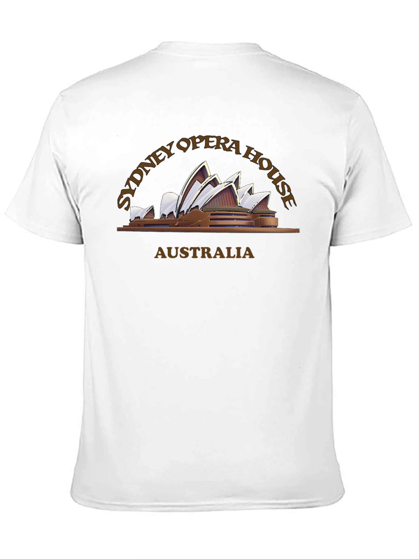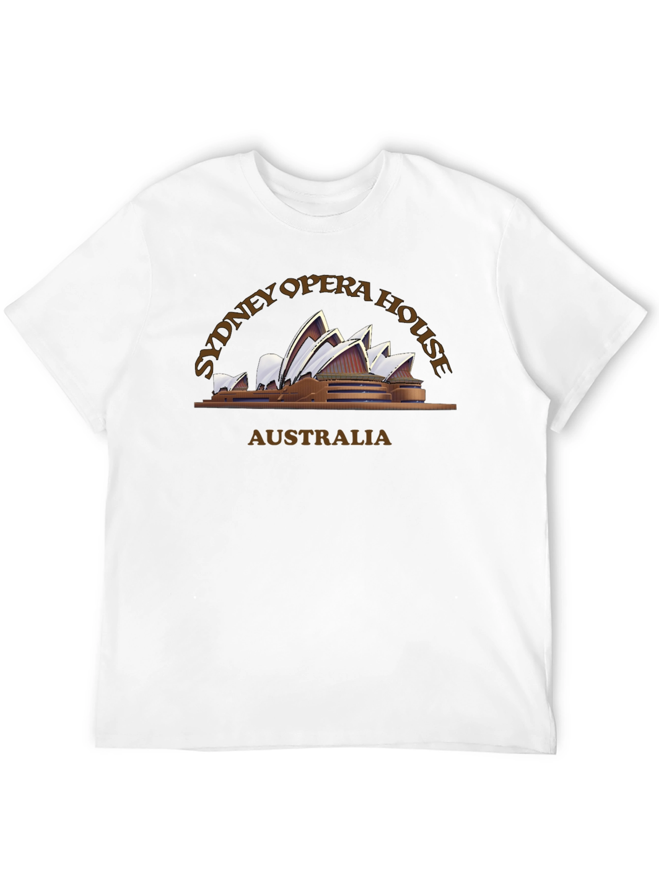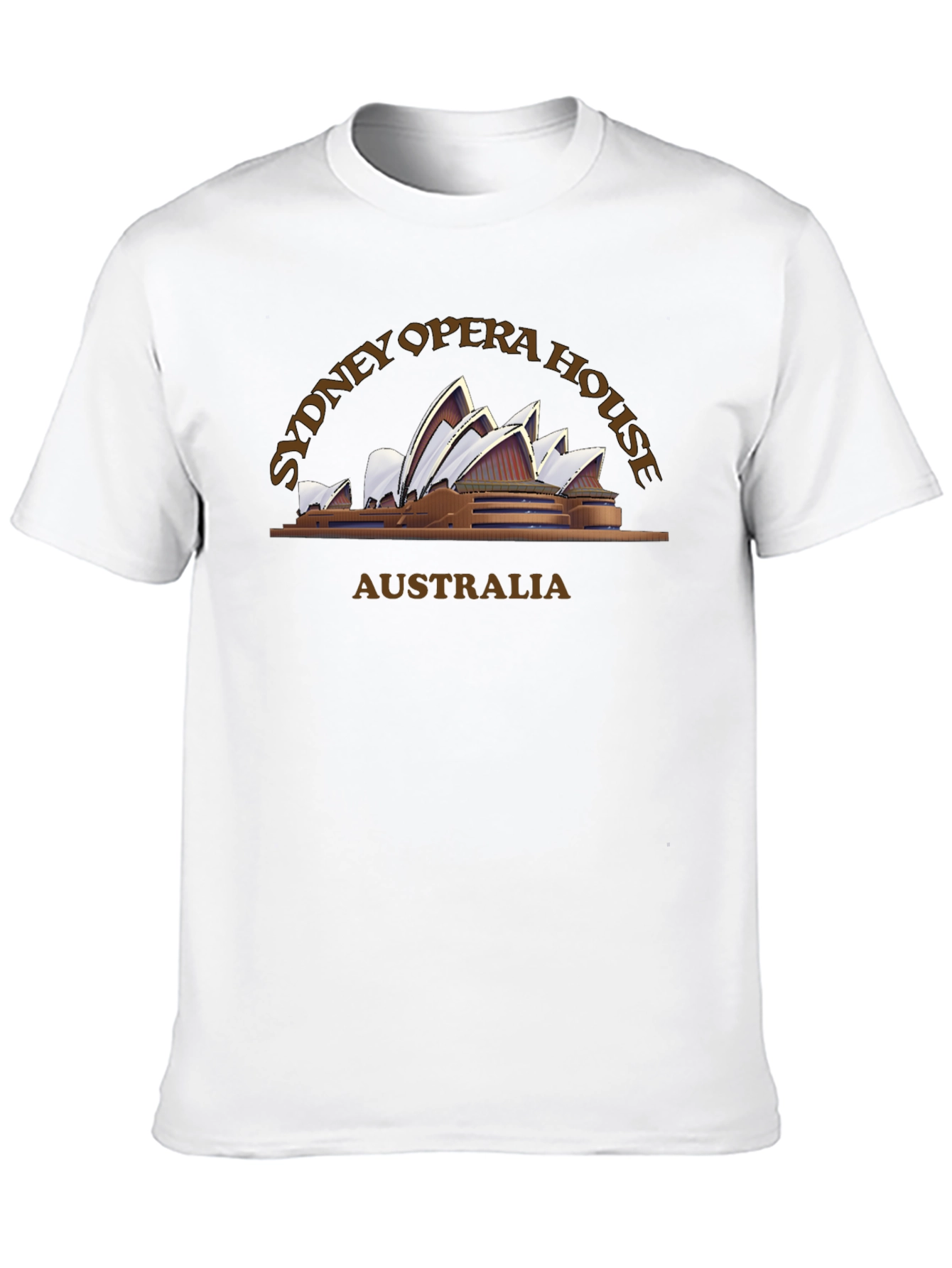 Show your love for Australia with this classic black T-shirt! Featuring a detailed graphic of the iconic Sydney Opera House, this tee is a must-have for travelers and architecture enthusiasts. The print is gold and detailed and appears to be on soft, comfortable fabric making it ideal for everyday wear. Great as a souvenir or a stylish way to represent your favorite travel destination. Add a touch of Aussie charm to your wardrobe with this unique and eye-catching tee!