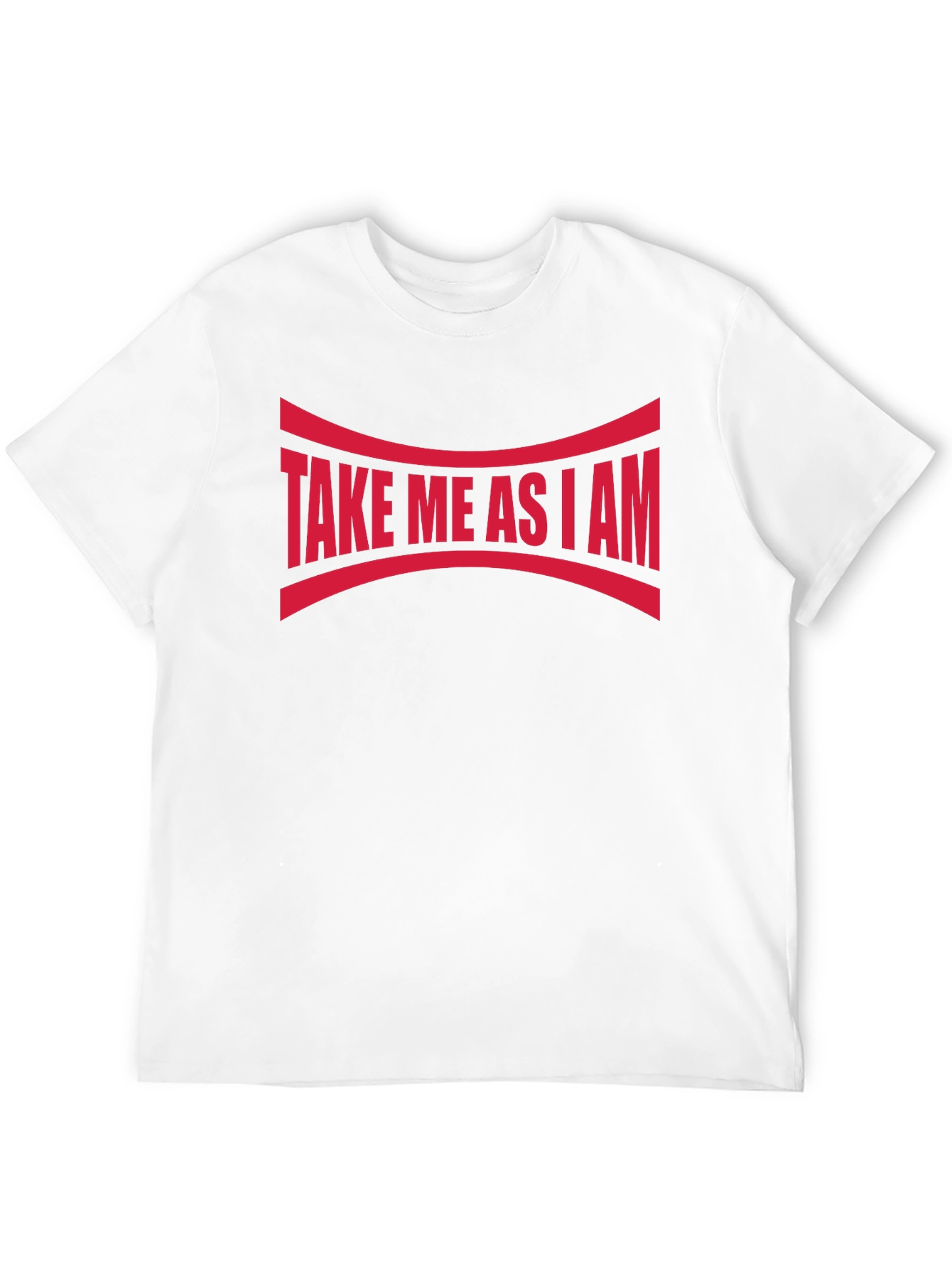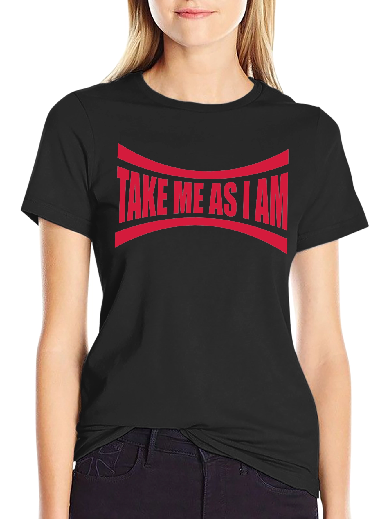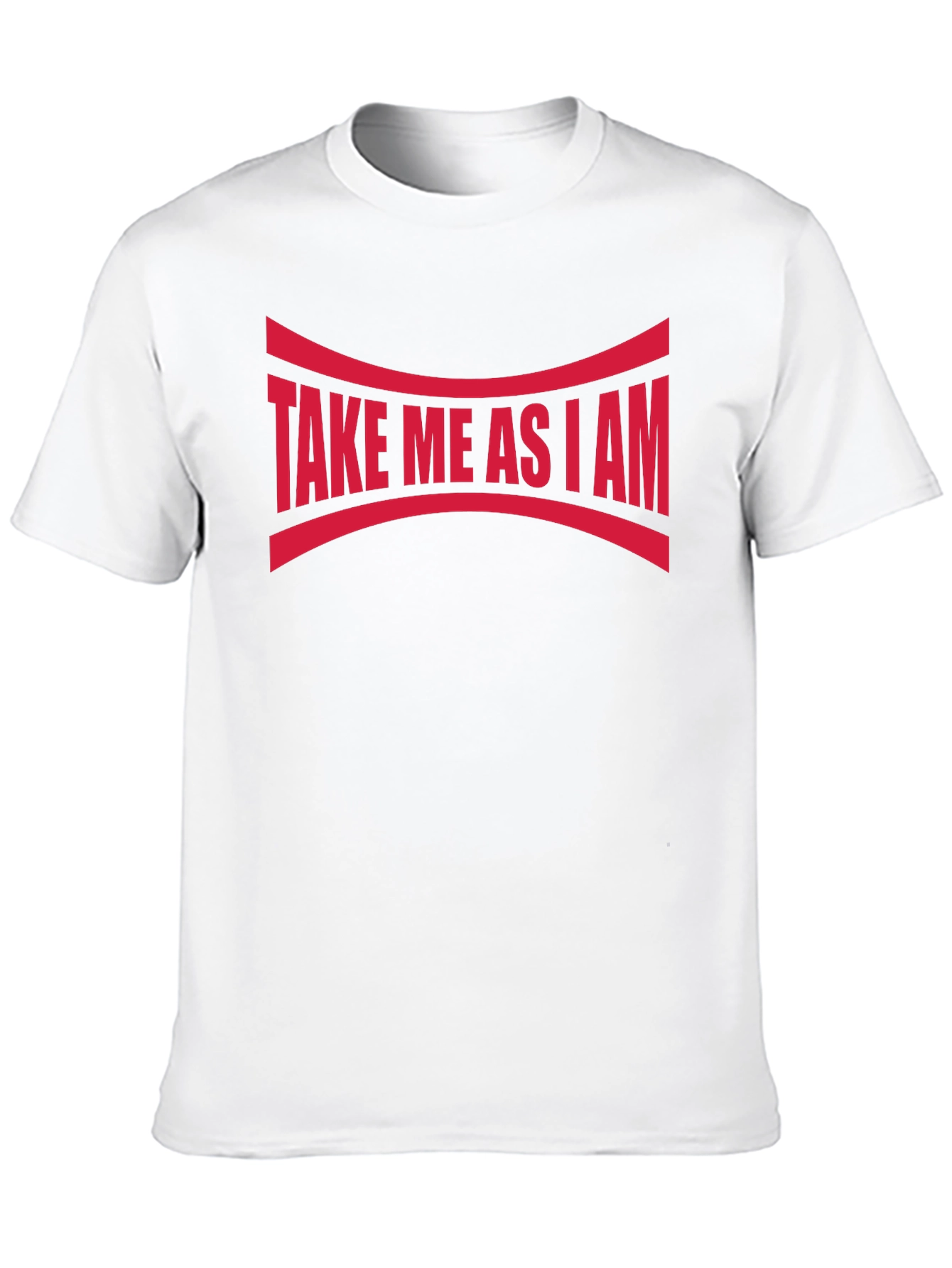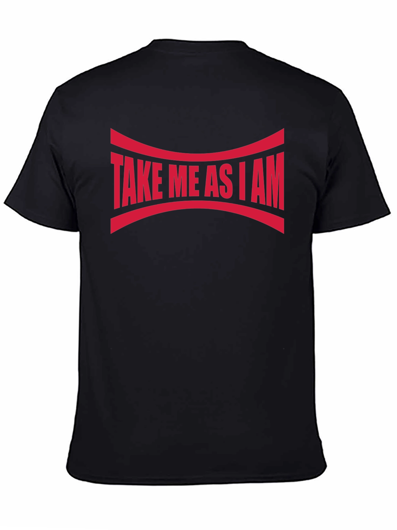 Show off your unique self with this bold "Take Me As I Am" graphic tee. Featuring a striking red design emblazoned across a sleek black background, this statement piece is sure to turn heads. The curved lines above and below the text add an interesting visual element. Crafted from what appears to be a soft and breathable cotton blend, this comfortable tee is perfect for casual wear, making a statement, or layering under a jacket. The classic crew neck and short sleeves offer a timeless fit. Express yourself with confidence and individuality!