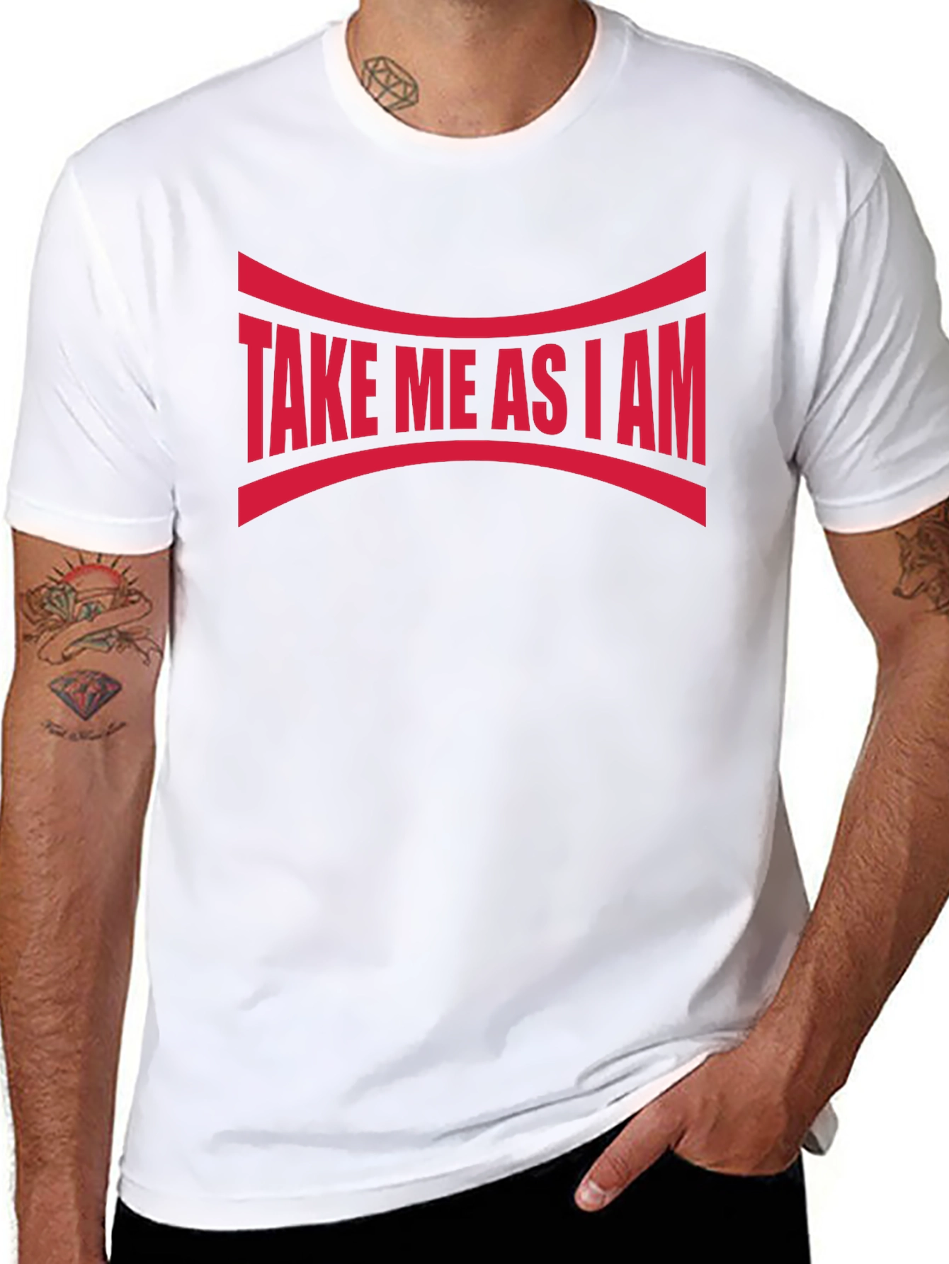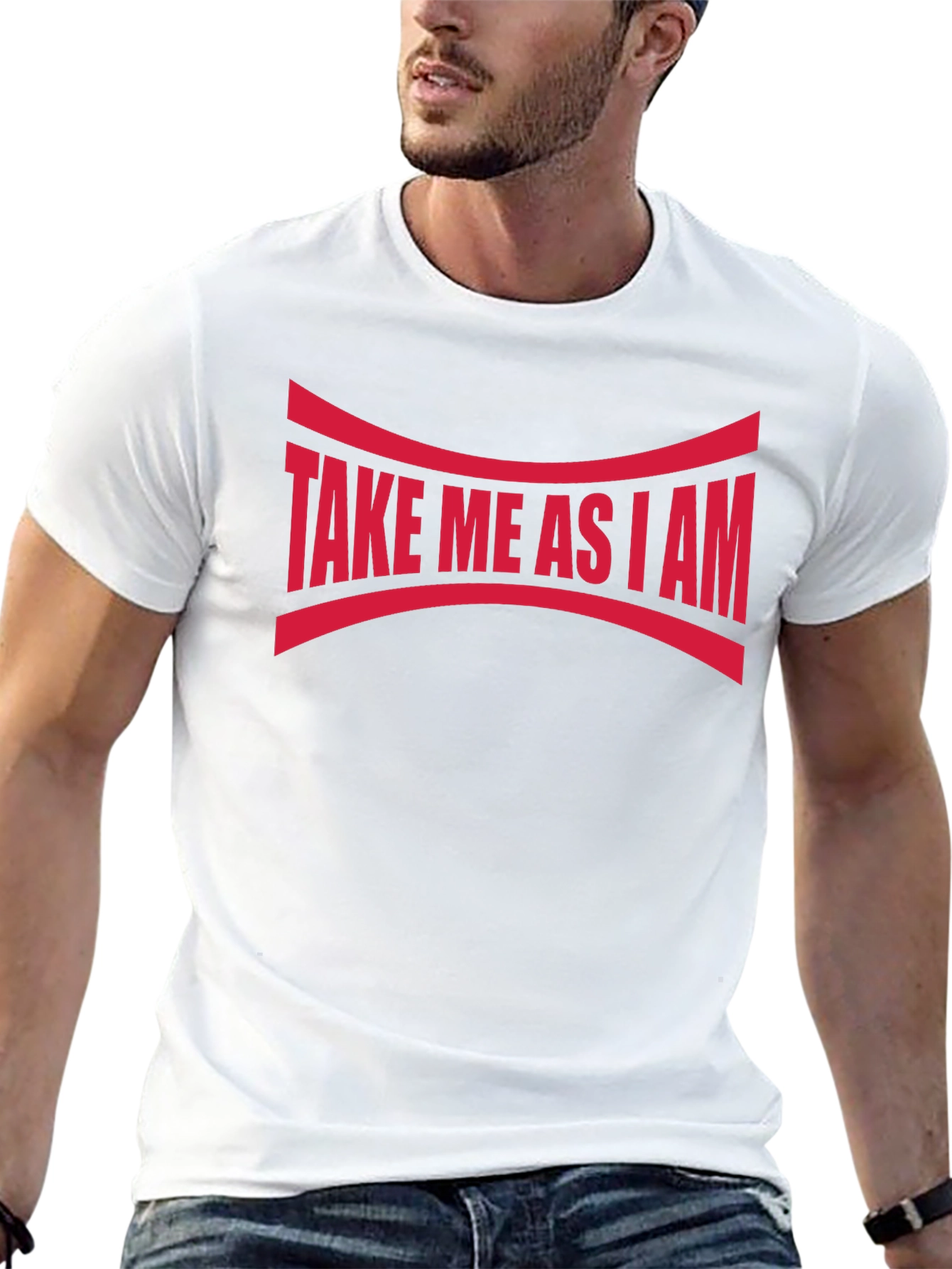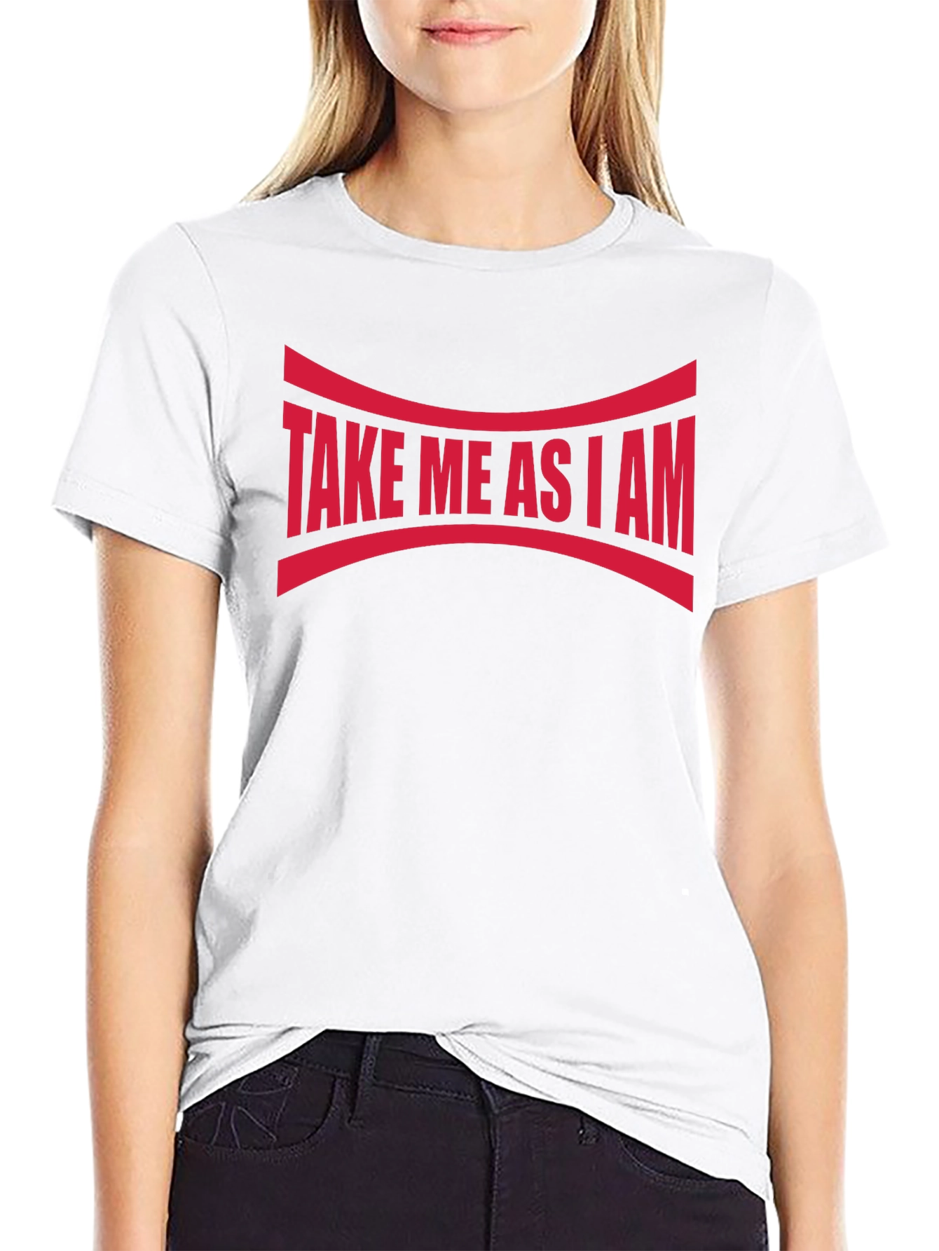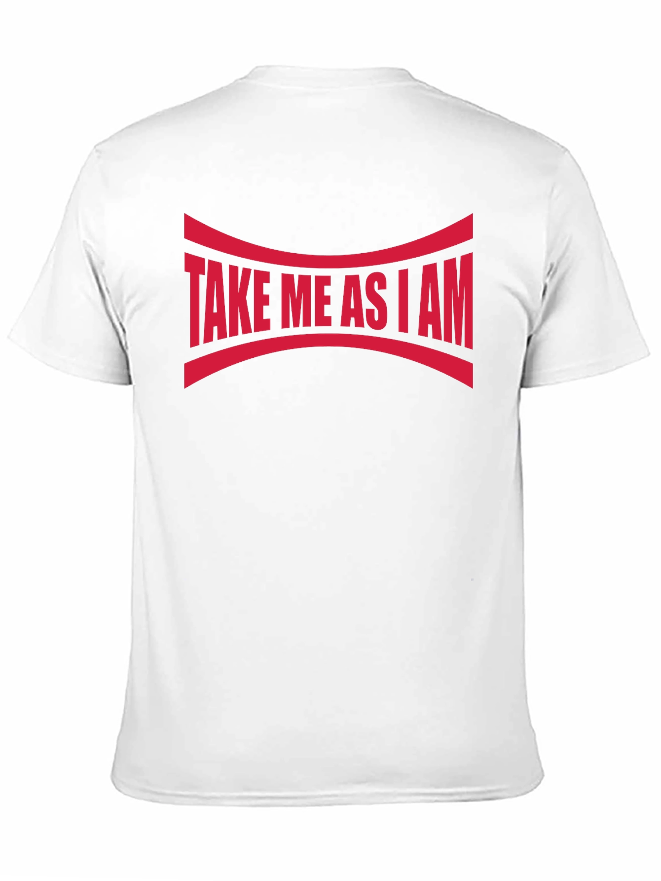 Show off your unique self with this bold "Take Me As I Am" graphic tee. Featuring a striking red design emblazoned across a sleek black background, this statement piece is sure to turn heads. The curved lines above and below the text add an interesting visual element. Crafted from what appears to be a soft and breathable cotton blend, this comfortable tee is perfect for casual wear, making a statement, or layering under a jacket. The classic crew neck and short sleeves offer a timeless fit. Express yourself with confidence and individuality!