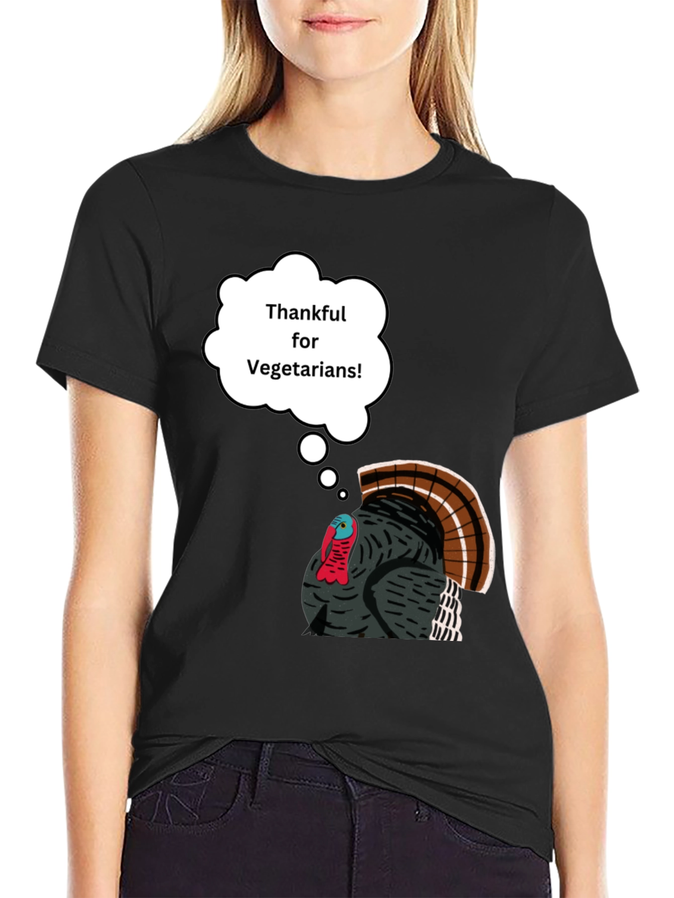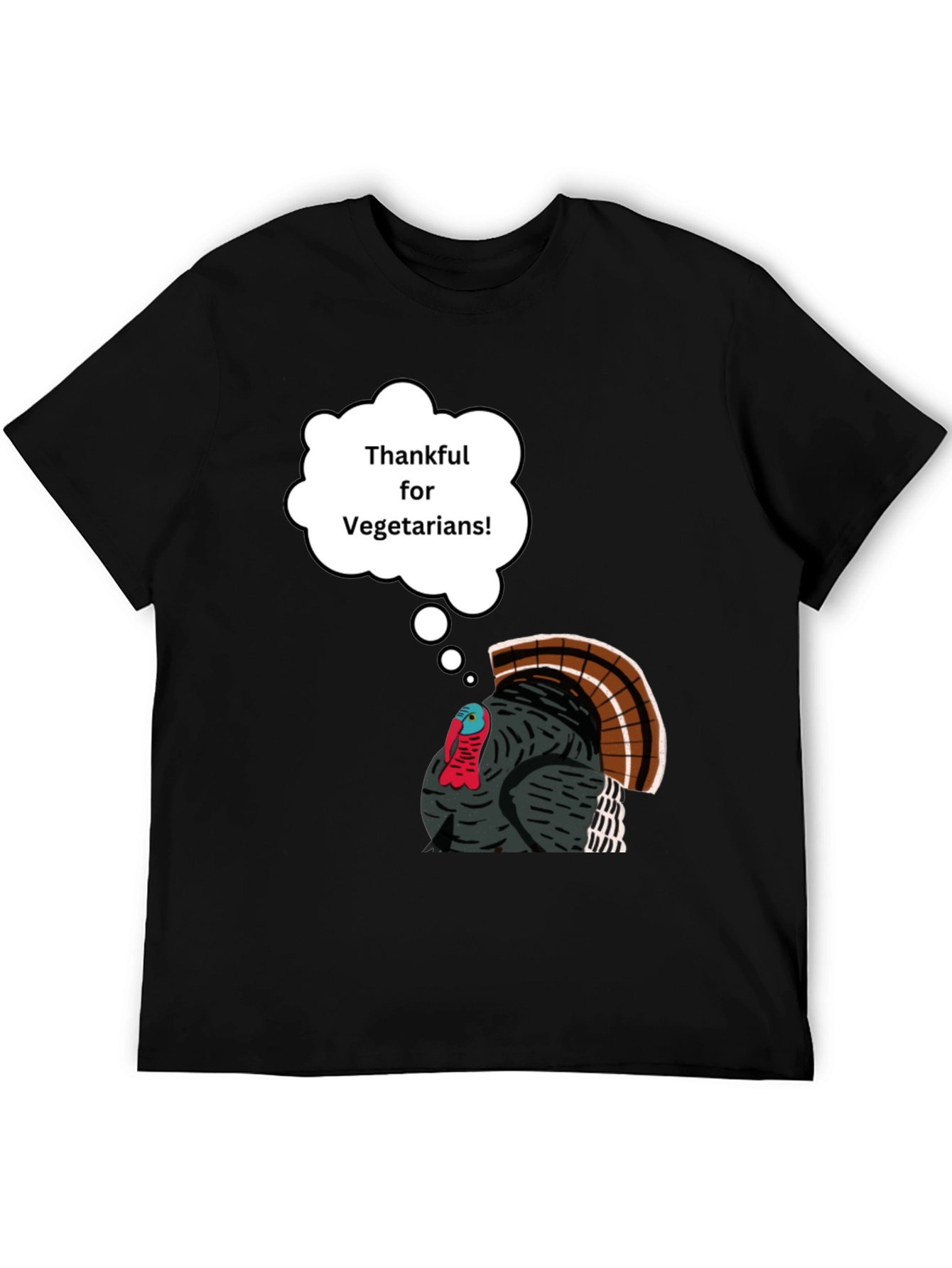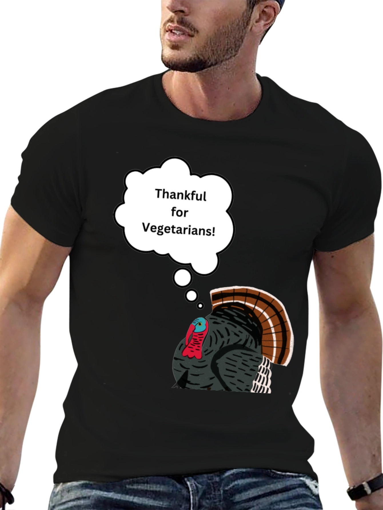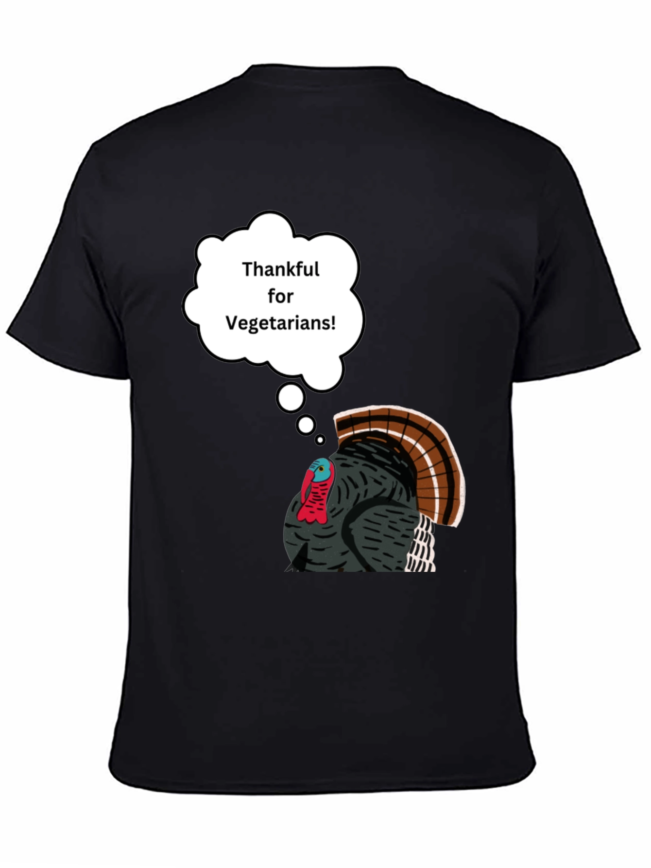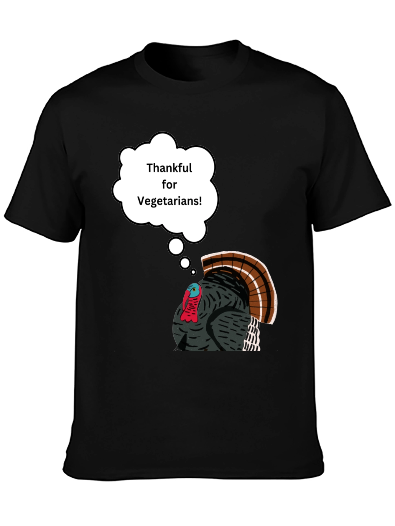 Celebrate Thanksgiving with a humorous twist with this black "Thankful for Vegetarians" T-shirt. Featuring a cartoon turkey design, this tee is perfect for those who appreciate a lighthearted take on the holiday. Made from what appears to be soft, comfortable fabric, it's ideal for casual wear during Thanksgiving gatherings or any day you want to share a laugh. The playful design with the turkey seemingly thinking the quote adds a touch of whimsy, making it a great conversation starter. Show off your sense of humor and gratitude for plant-based diets with this unique and festive shirt.