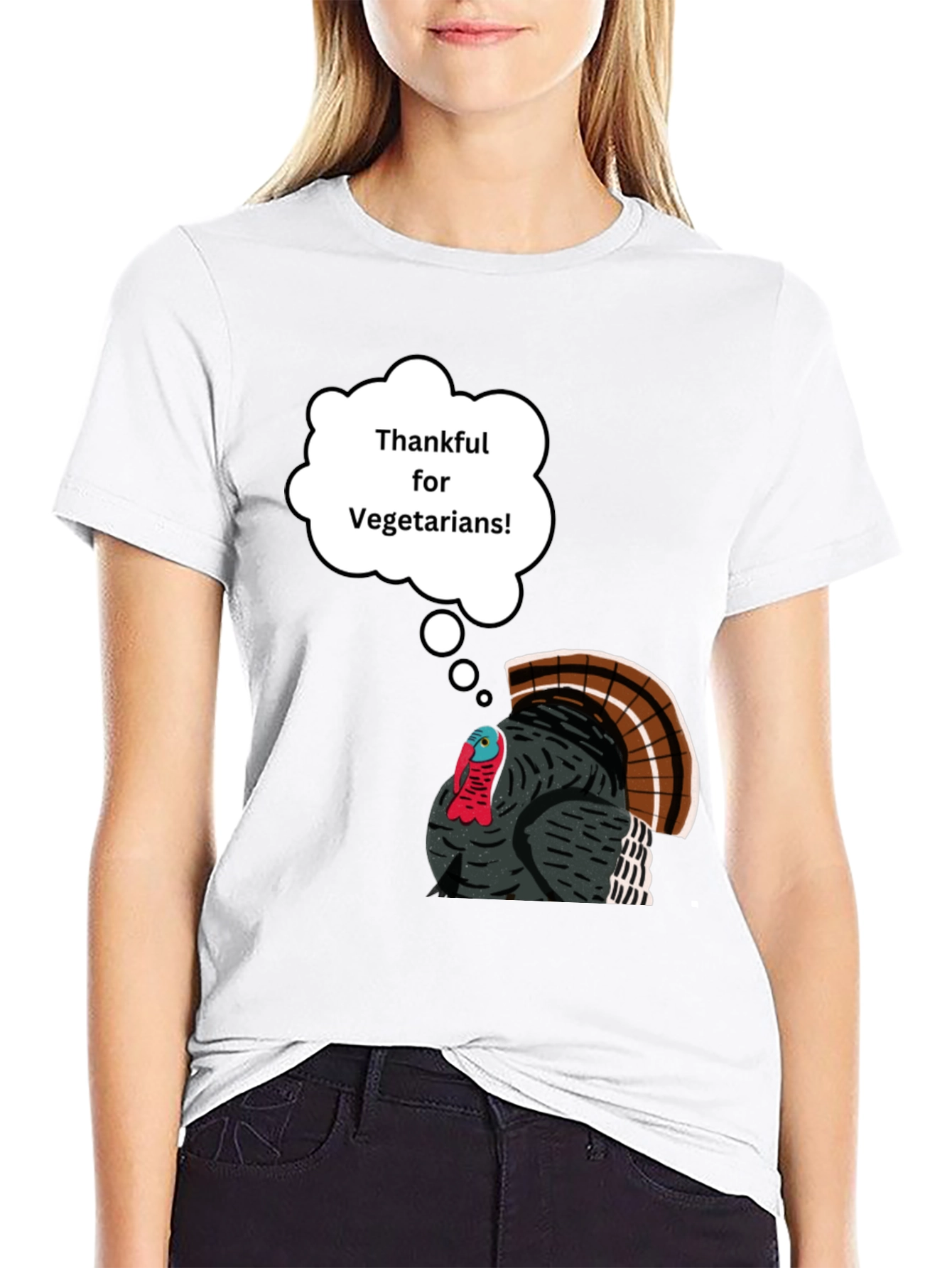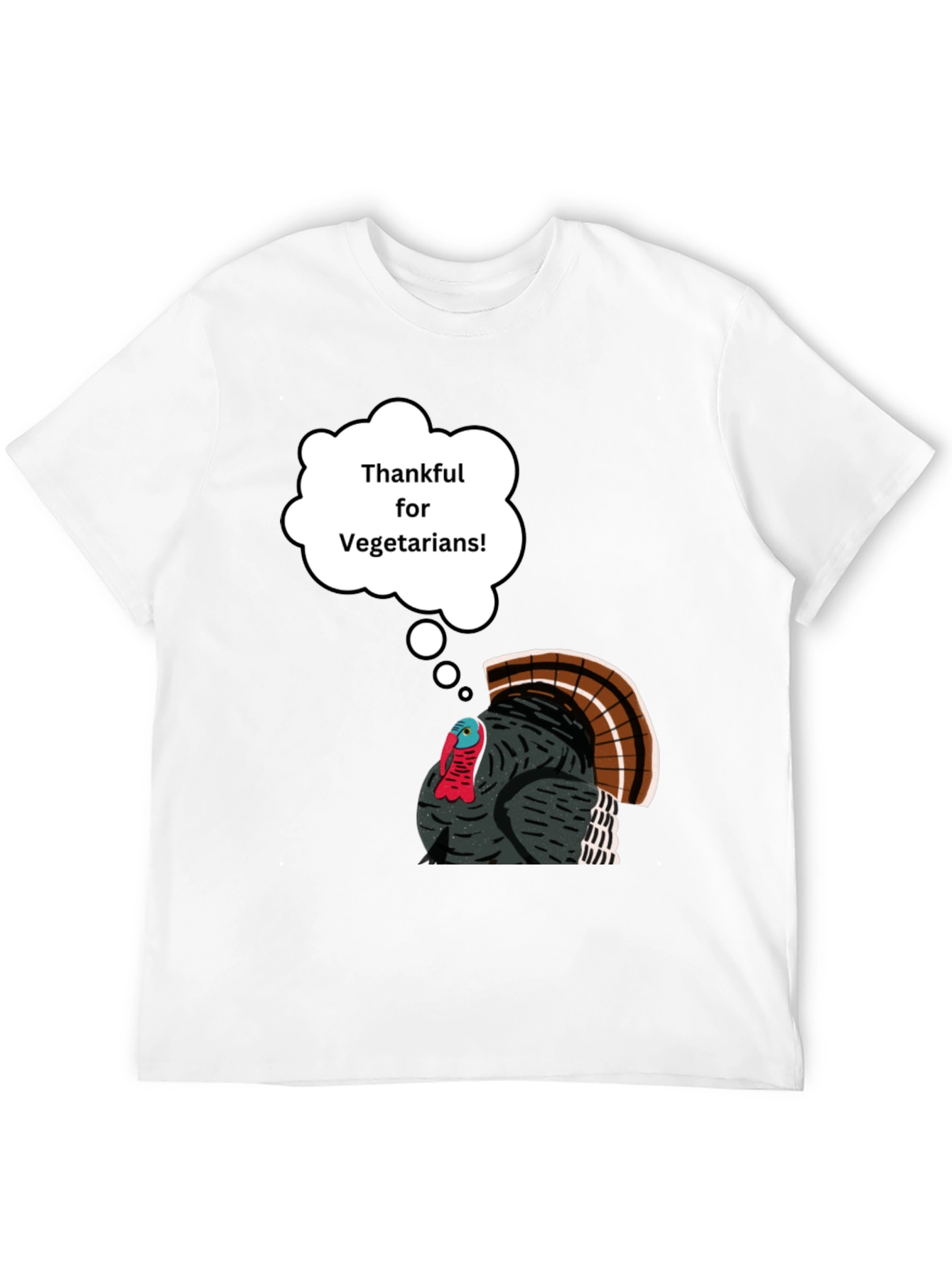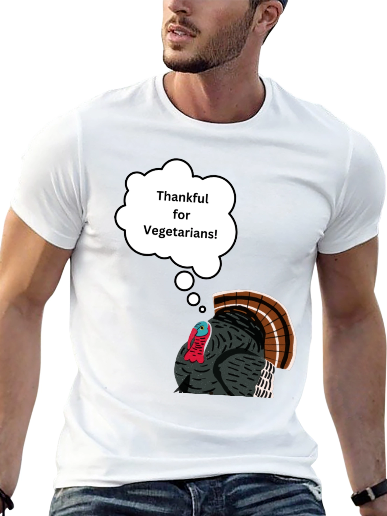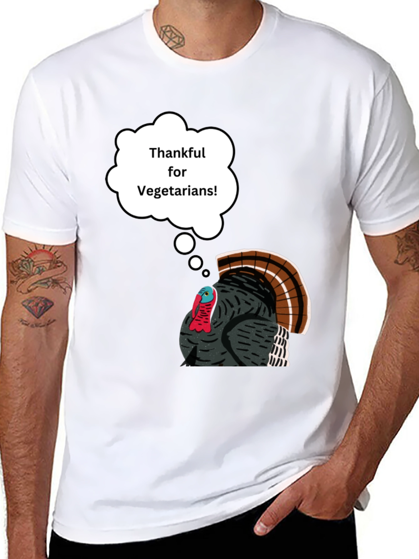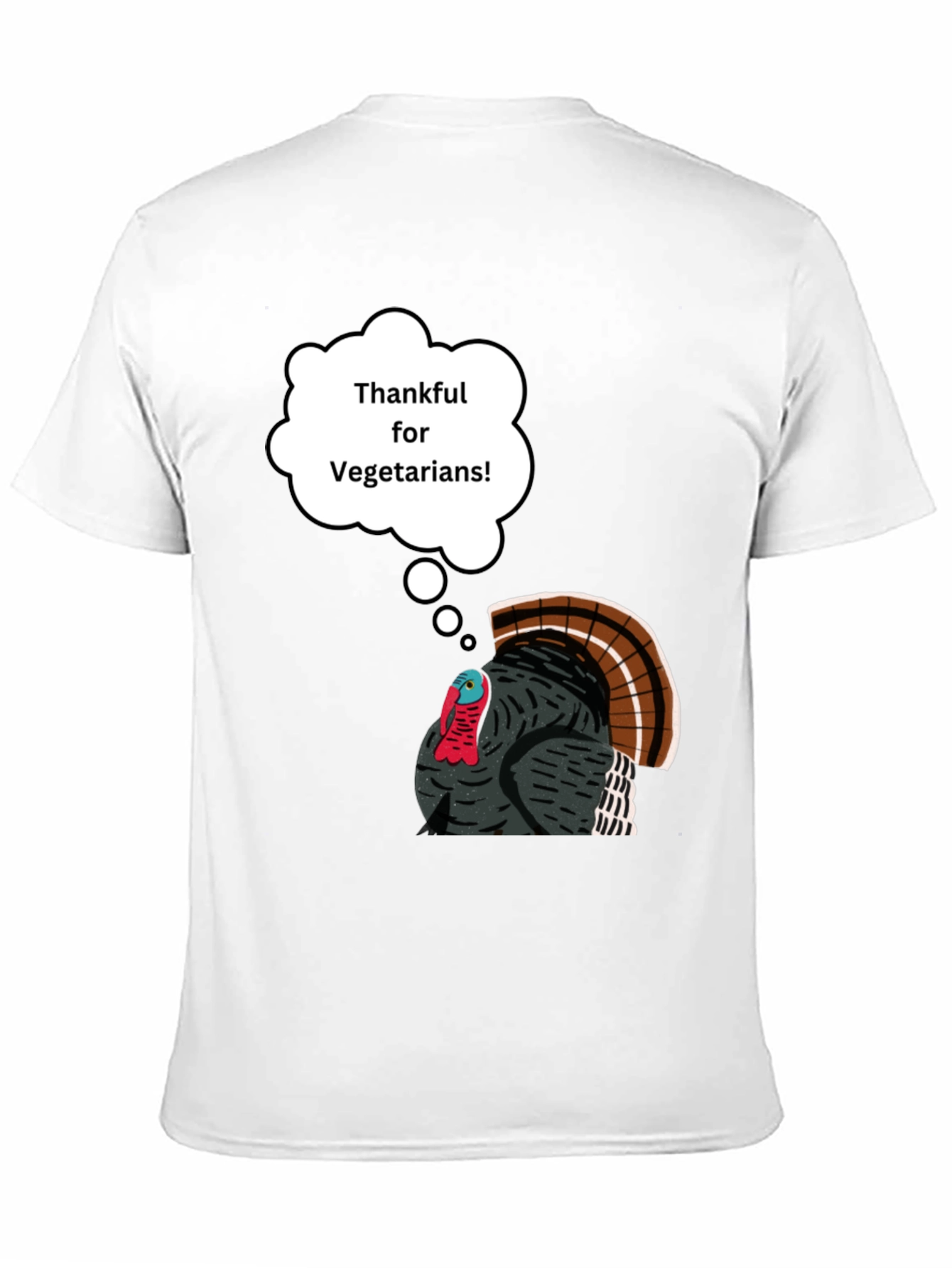 Celebrate Thanksgiving with a humorous twist with this black "Thankful for Vegetarians" T-shirt. Featuring a cartoon turkey design, this tee is perfect for those who appreciate a lighthearted take on the holiday. Made from what appears to be soft, comfortable fabric, it's ideal for casual wear during Thanksgiving gatherings or any day you want to share a laugh. The playful design with the turkey seemingly thinking the quote adds a touch of whimsy, making it a great conversation starter. Show off your sense of humor and gratitude for plant-based diets with this unique and festive shirt.
