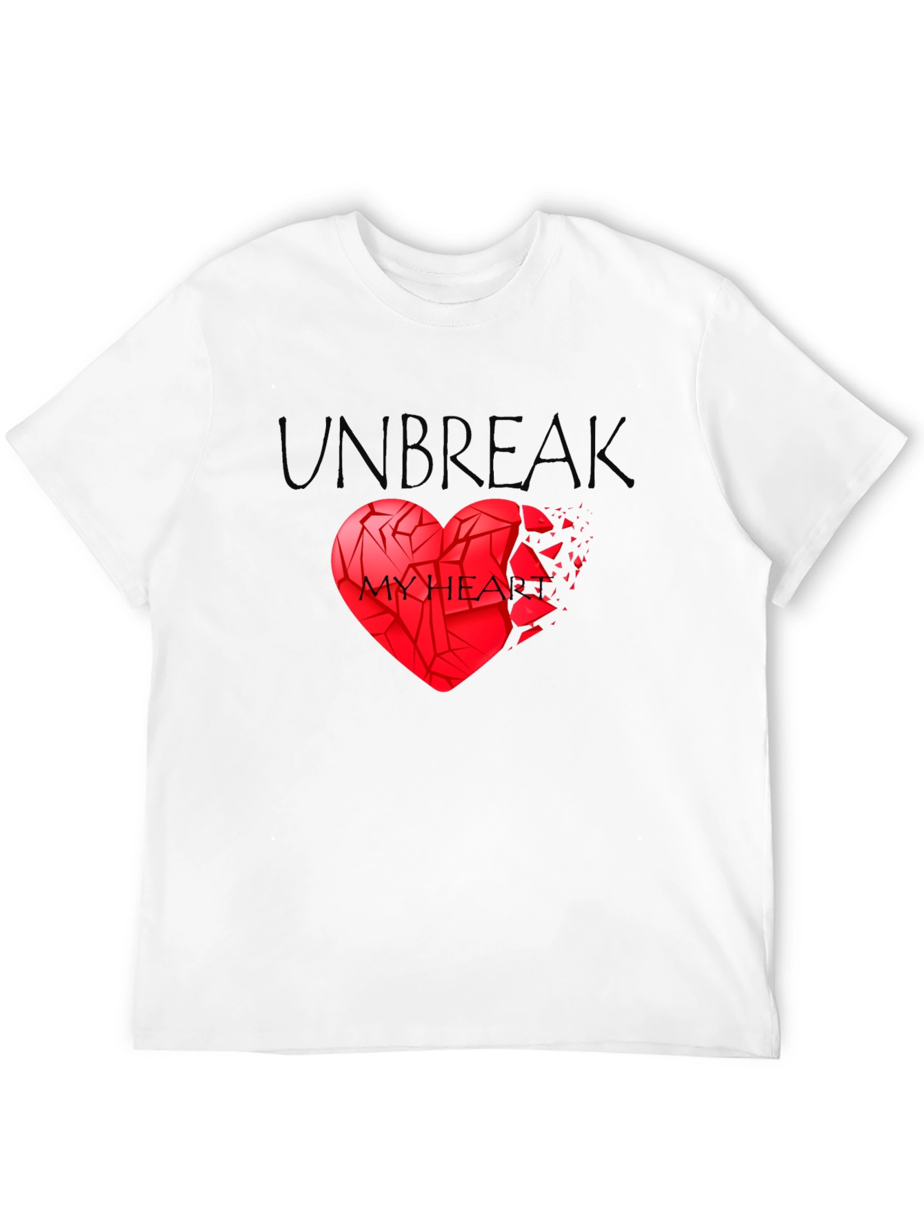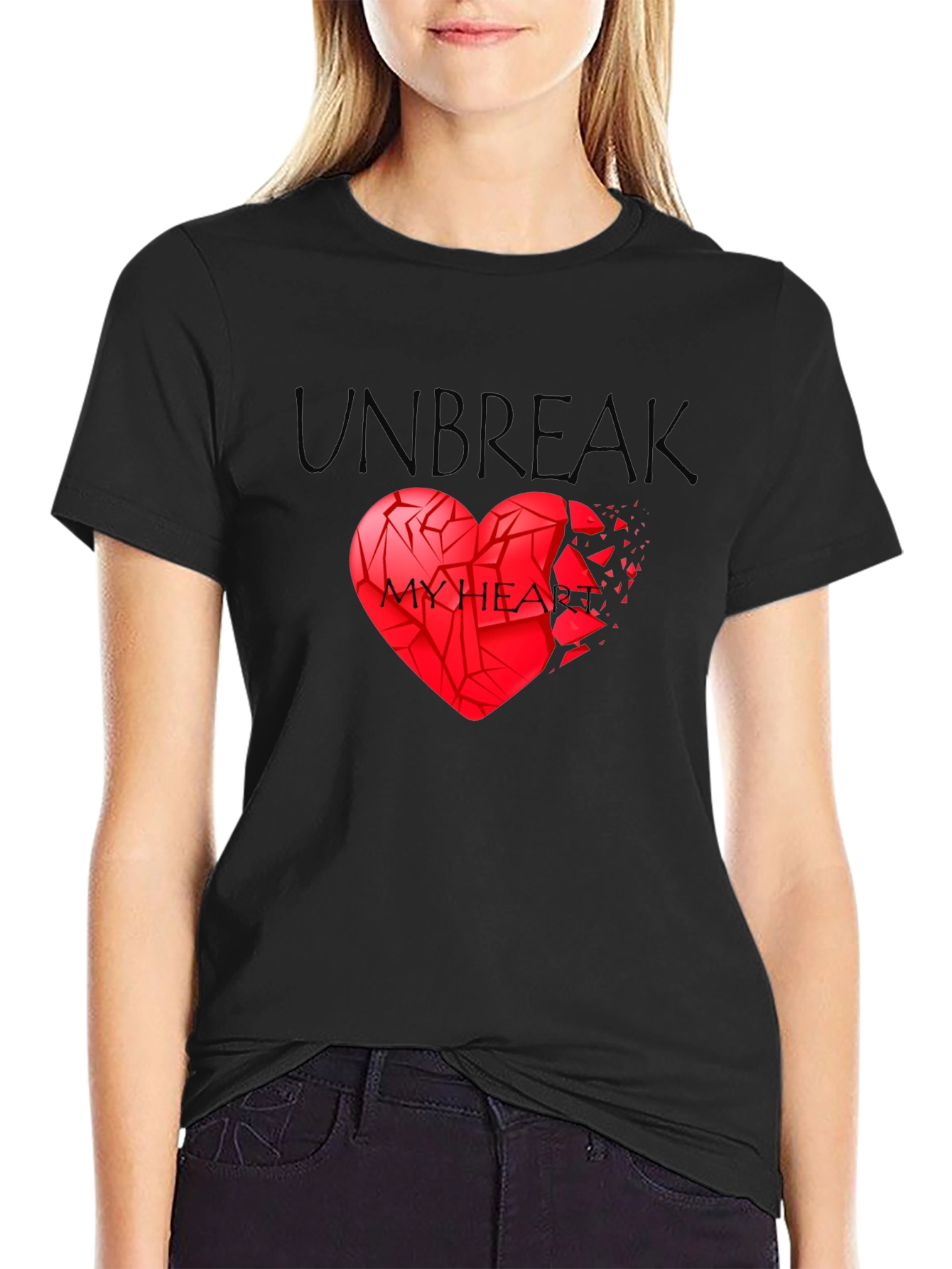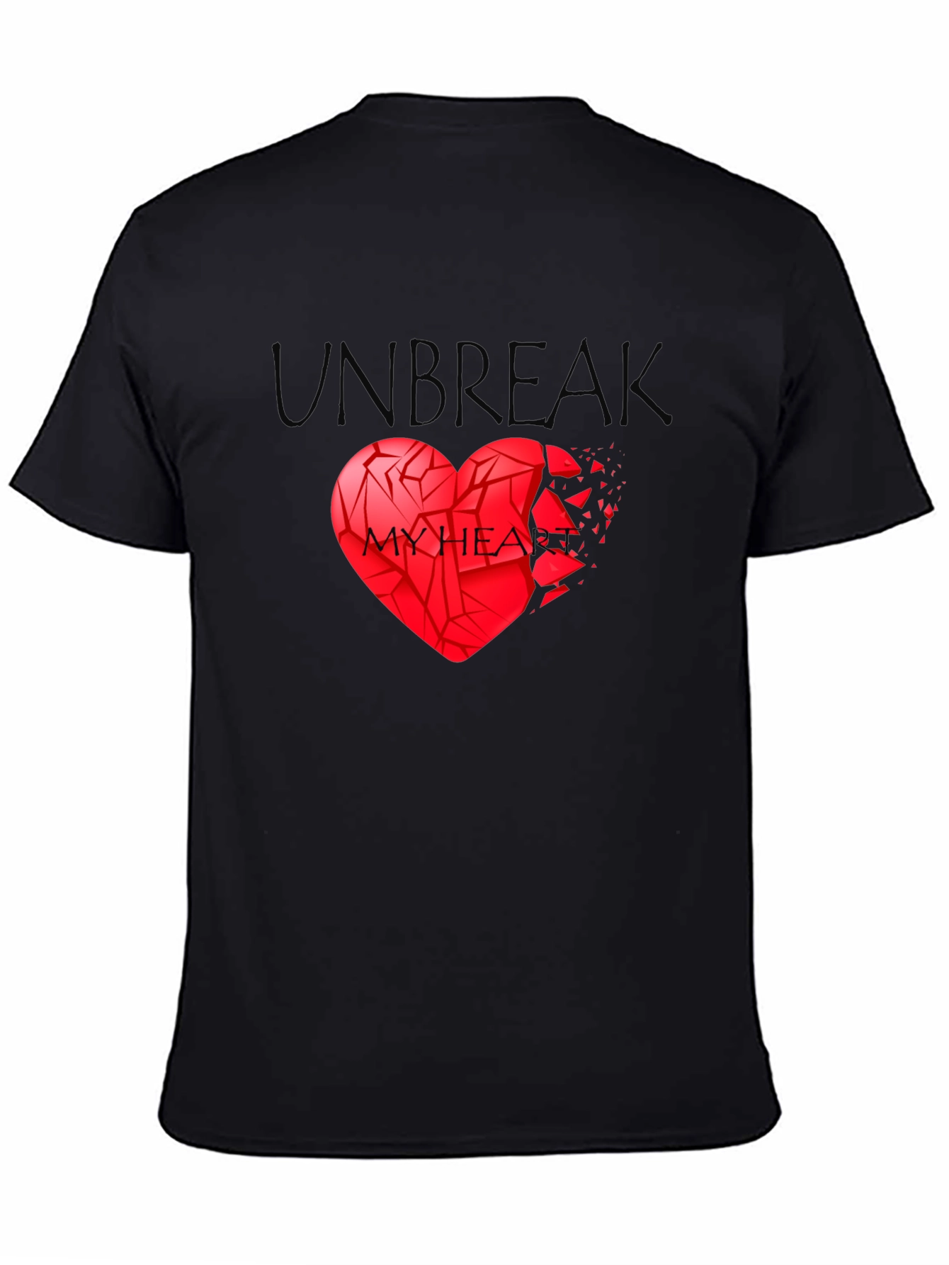 Show off your sentimental side with this eye-catching graphic tee! This shirt features a striking design of a red, shattered heart with the words "Unbreak My Heart." The bold graphic is printed on a soft, comfortable black tee. Perfect for casual outings, concerts, or just lounging around the house, this tee is sure to spark conversations and add a touch of edgy romance to your wardrobe. It is a great gift for someone who loves music, or heart-themed apparel.