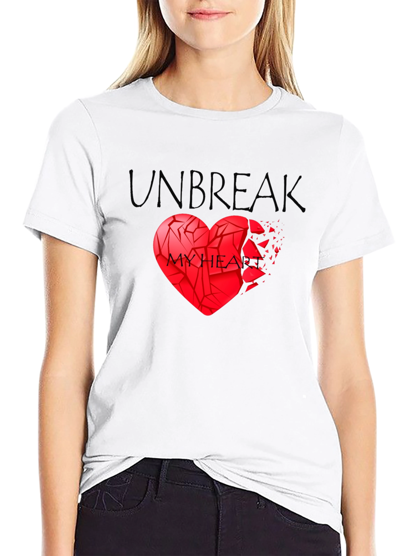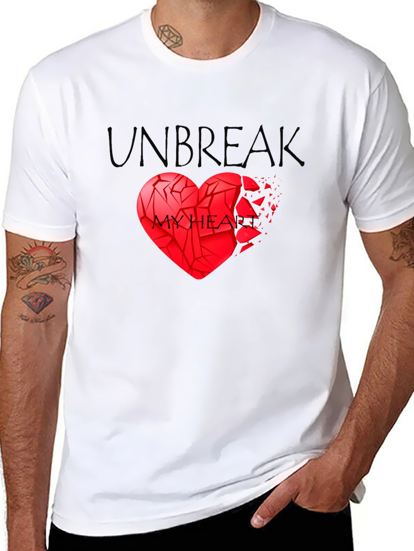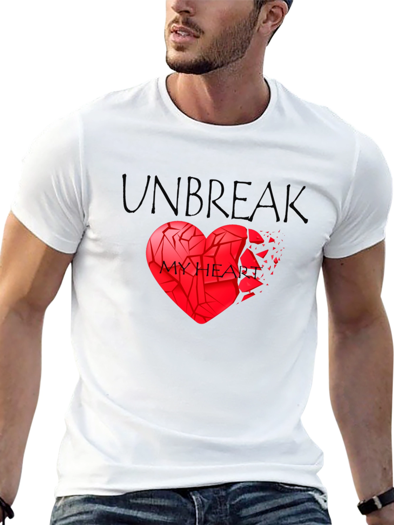 Show off your sentimental side with this eye-catching graphic tee! This shirt features a striking design of a red, shattered heart with the words "Unbreak My Heart." The bold graphic is printed on a soft, comfortable black tee. Perfect for casual outings, concerts, or just lounging around the house, this tee is sure to spark conversations and add a touch of edgy romance to your wardrobe. It is a great gift for someone who loves music, or heart-themed apparel.