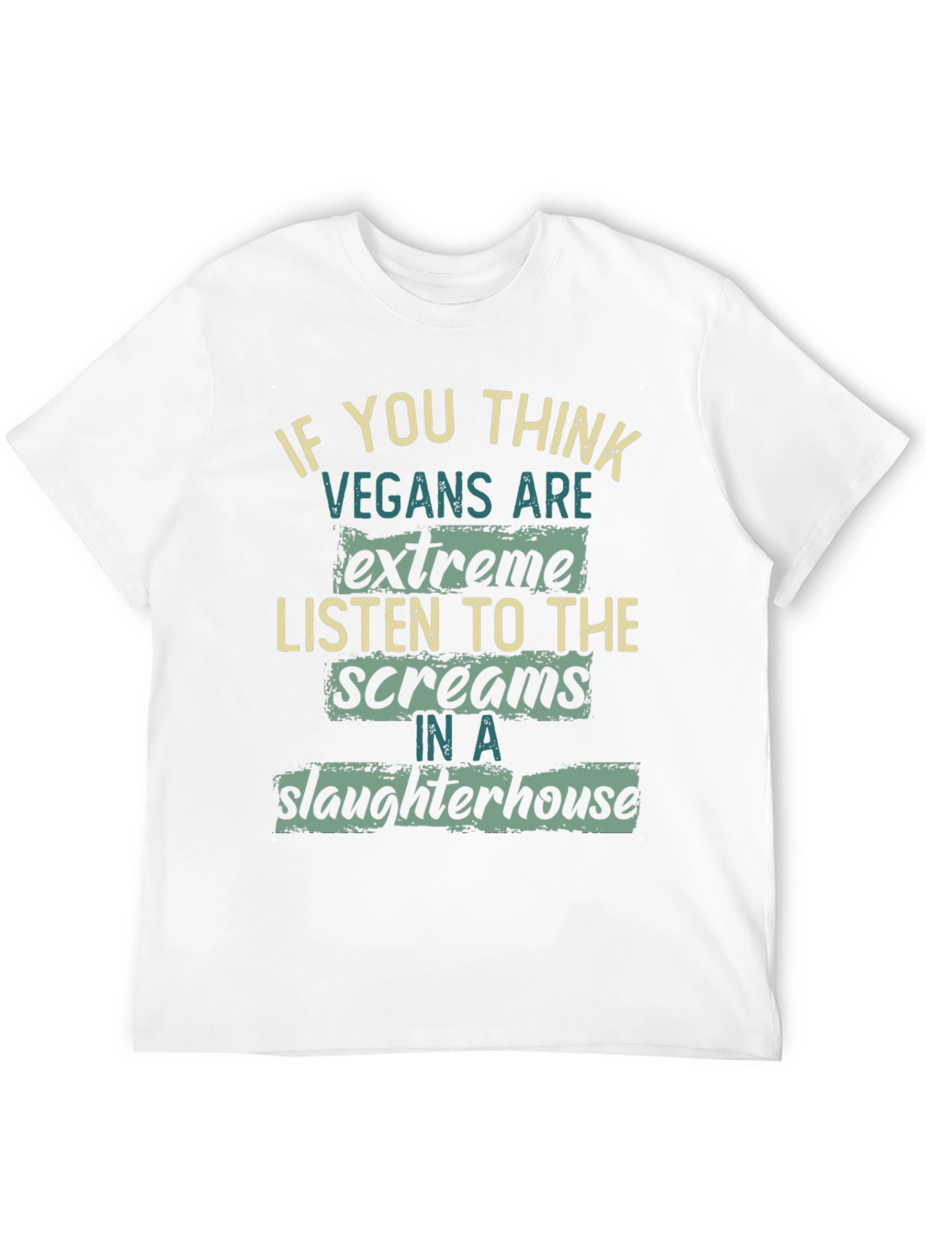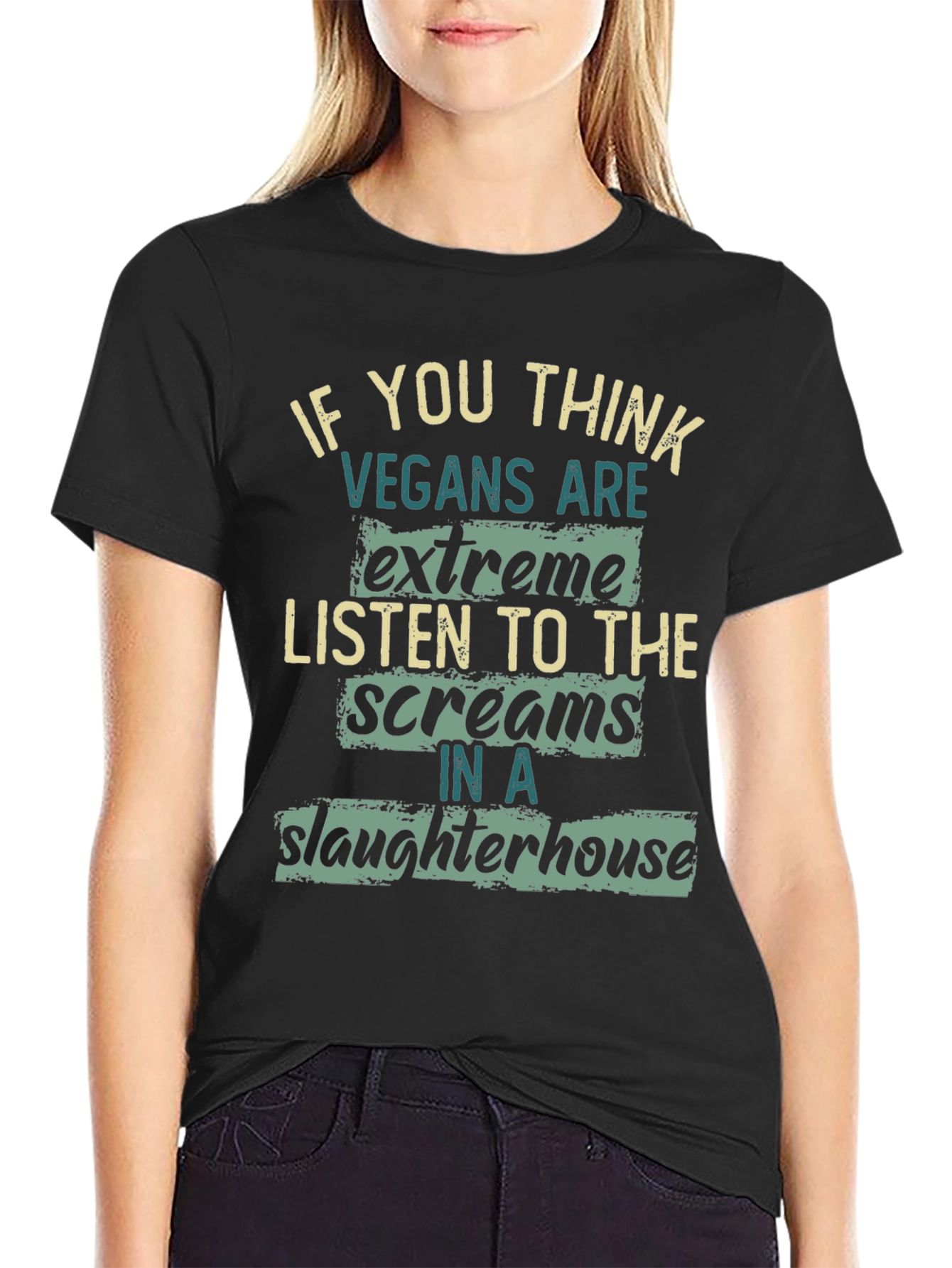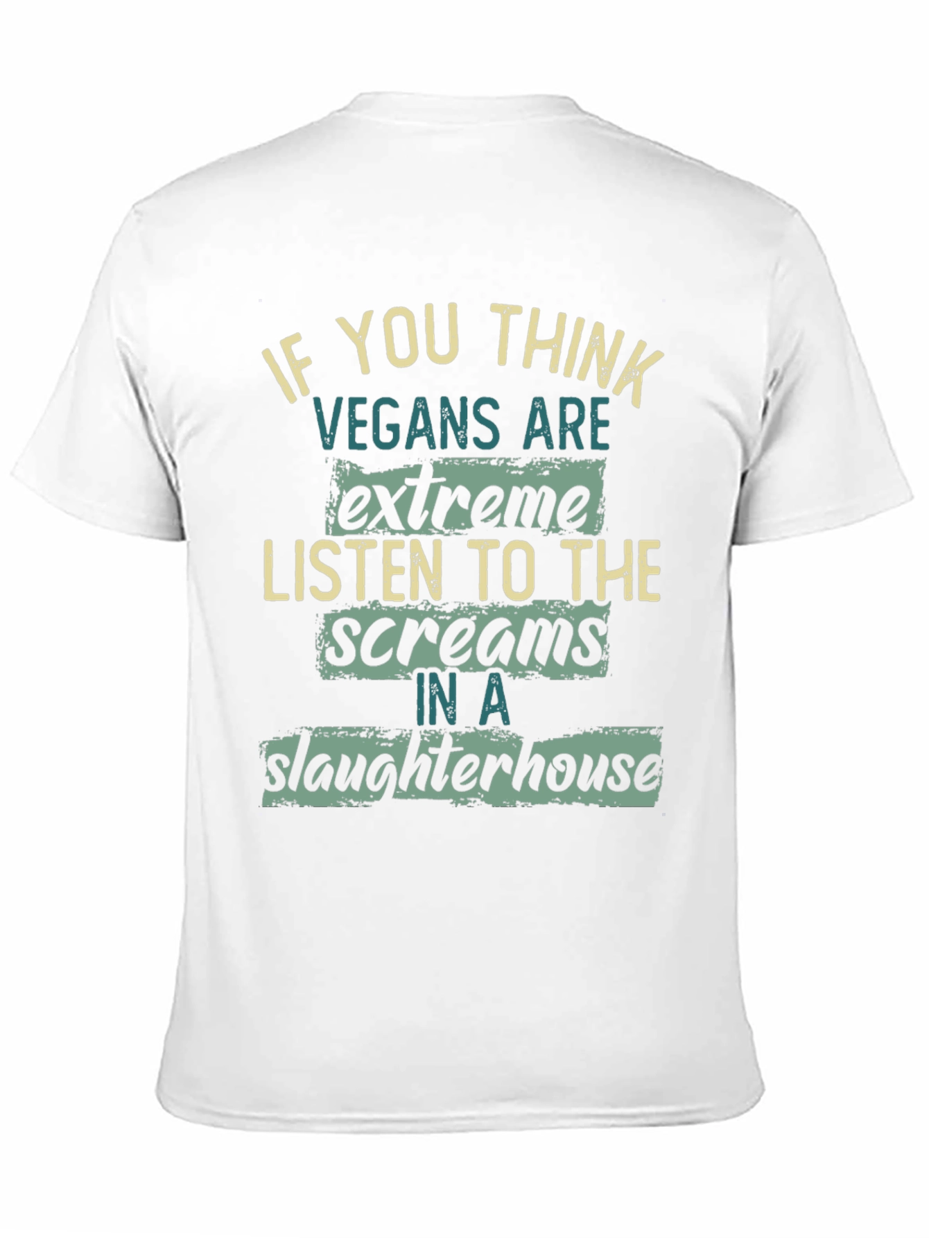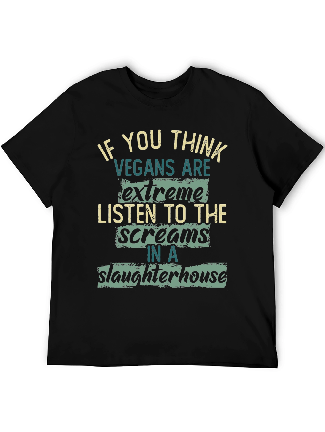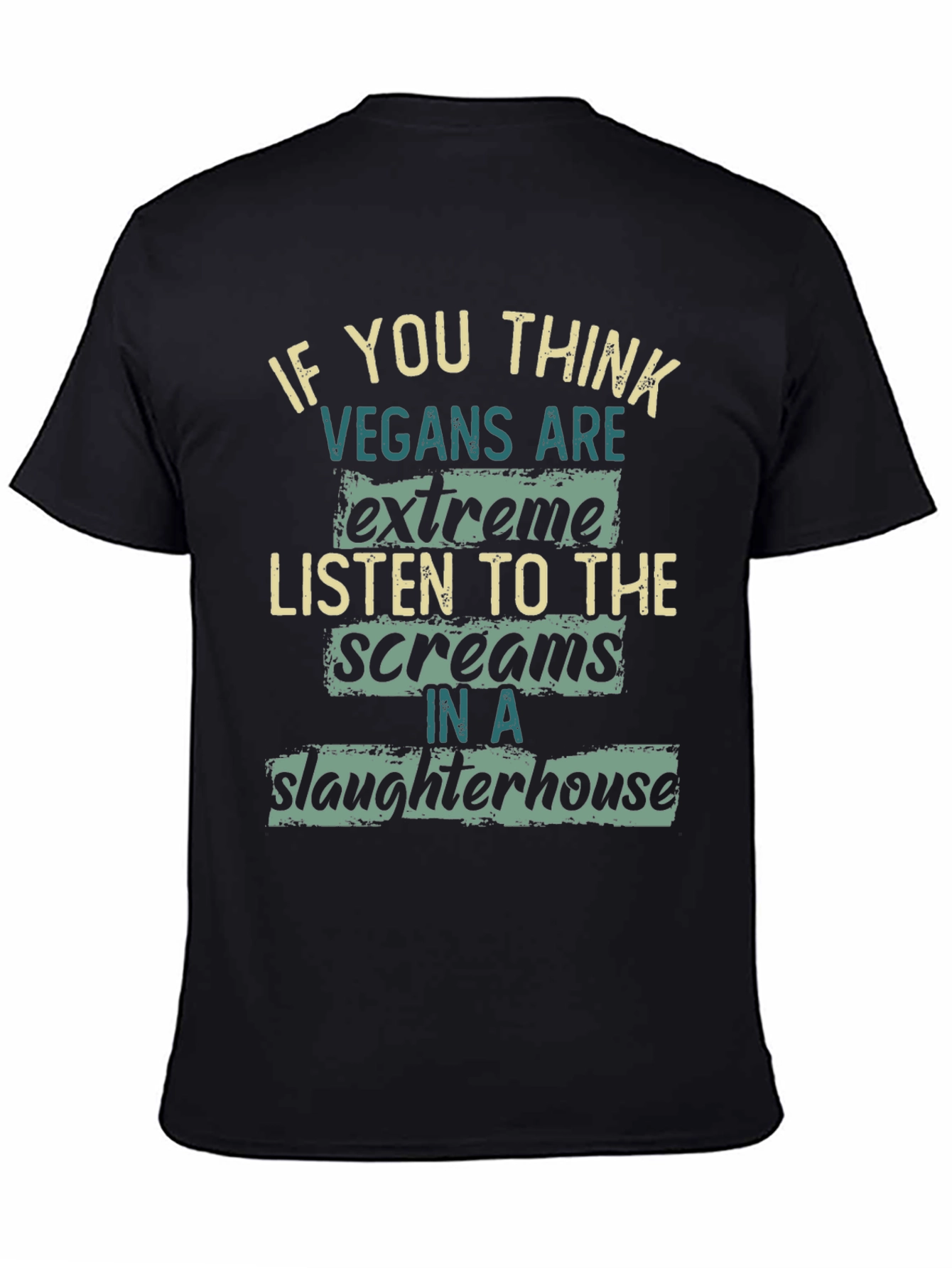 Make a statement with this bold, black t-shirt featuring a powerful message for animal lovers. The design showcases the phrase "If You Think Vegans Are Extreme Listen To The Screams In A Slaughterhouse" in a vintage-inspired font with distressed green highlights. This tee is perfect for everyday wear, rallies, or sparking conversations about ethical eating. Made from a soft, comfortable fabric, it offers a great fit and feel. Show your support for animal rights in style with this impactful graphic tee. Ideal for vegans, animal advocates, and anyone passionate about making a change.