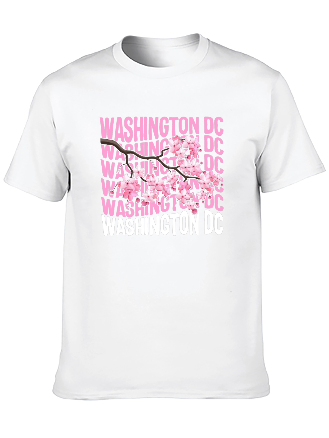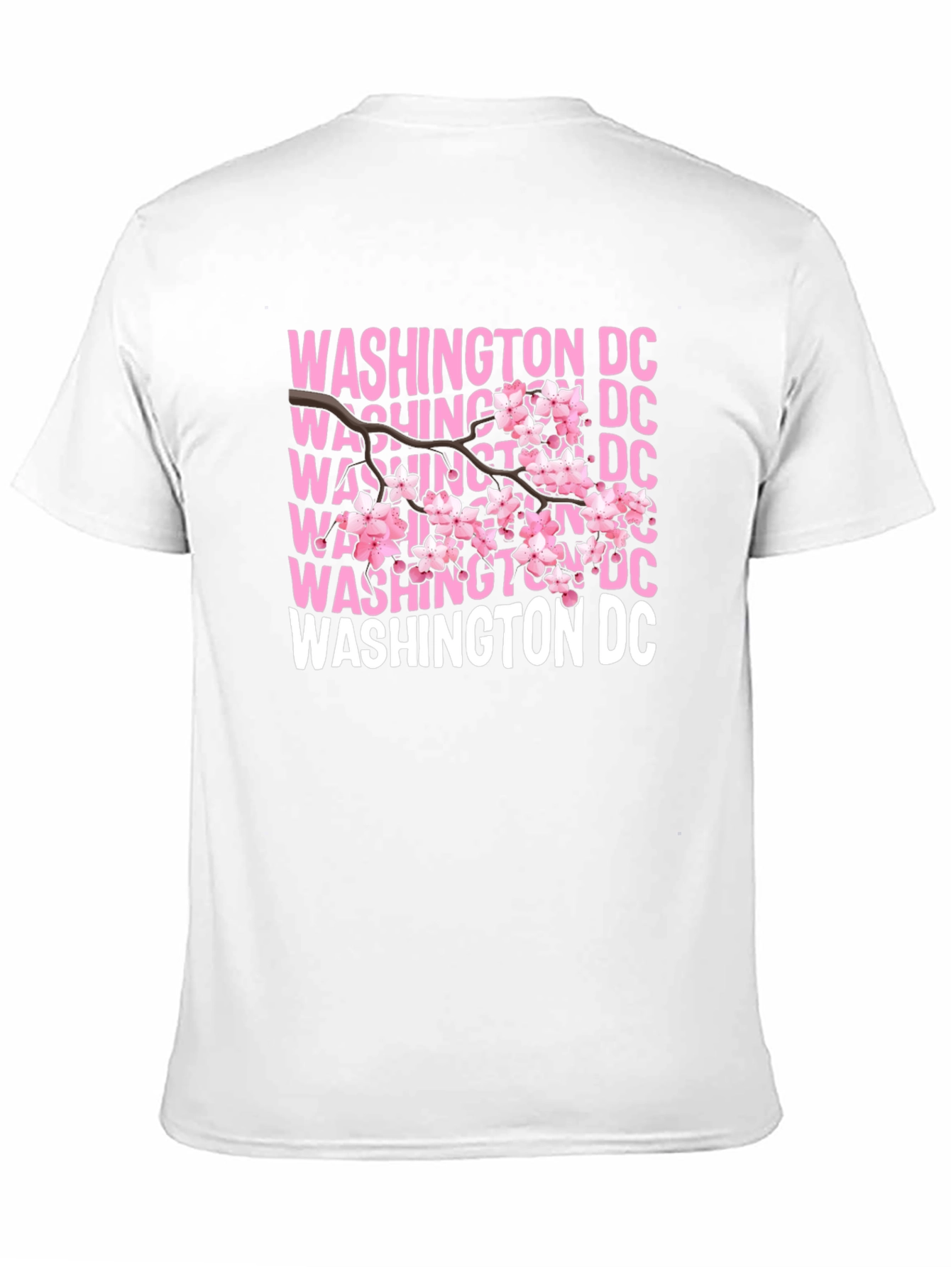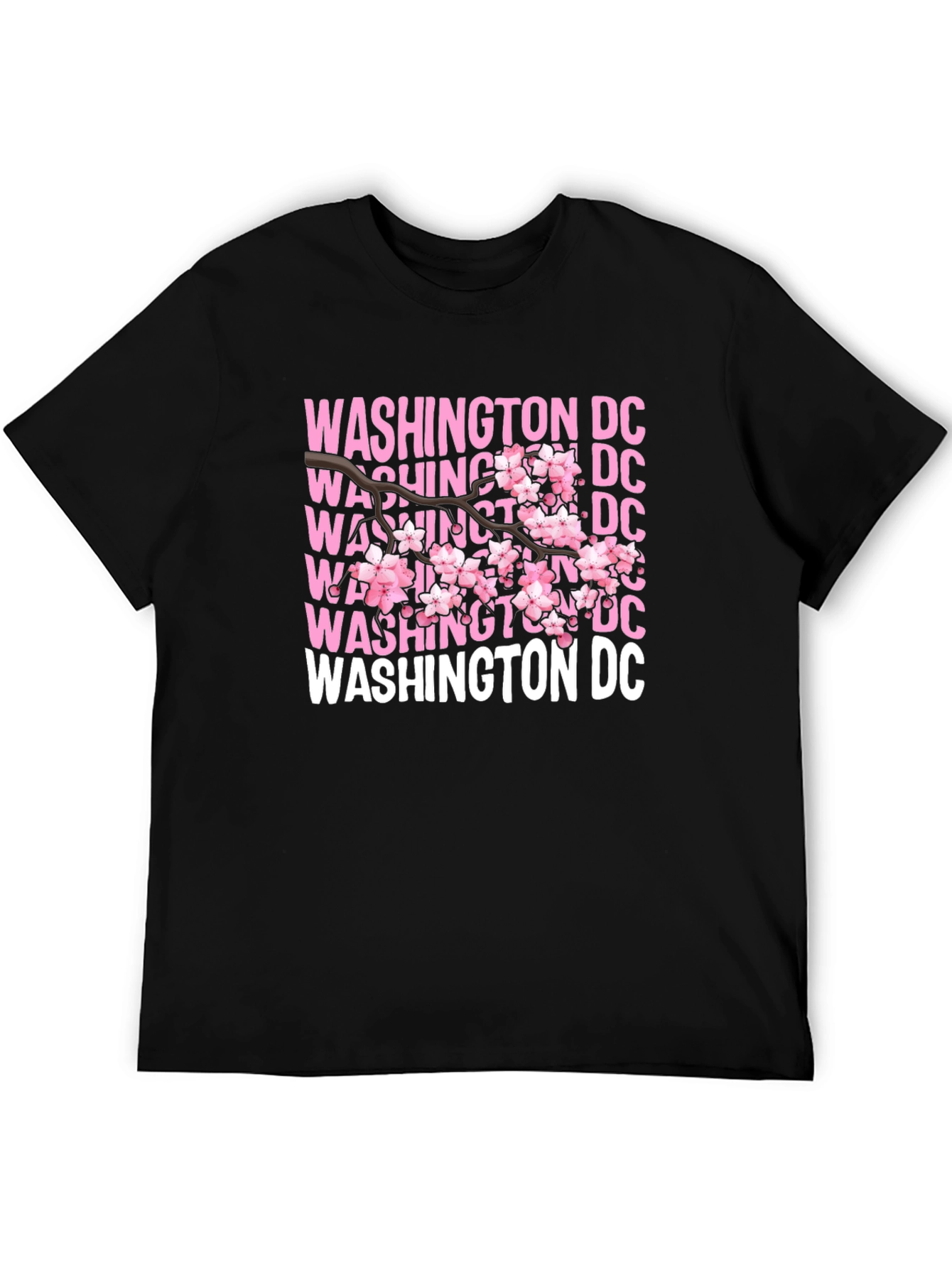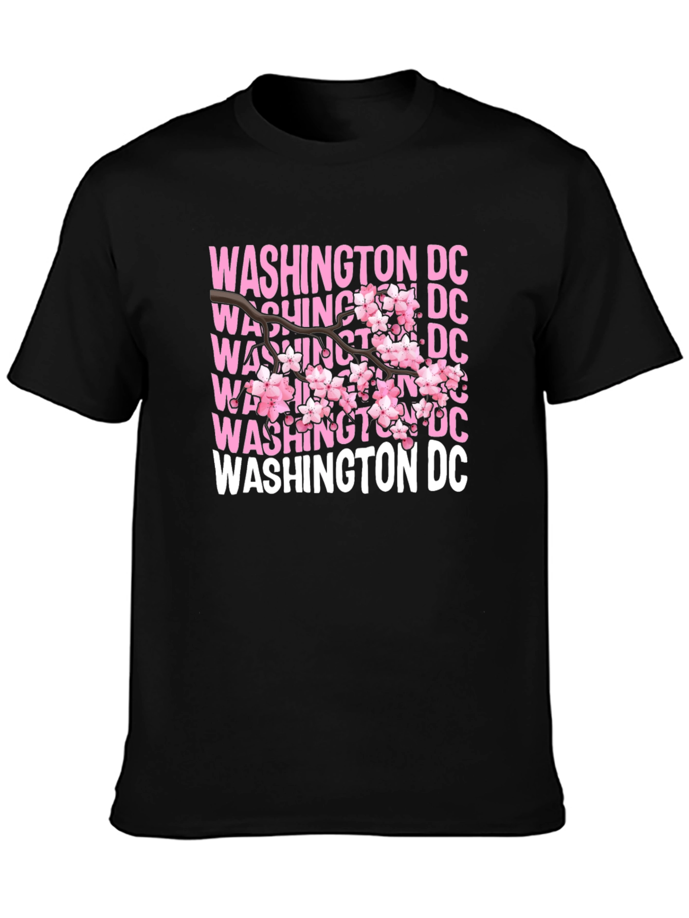 Show off your love for DC with this stylish graphic tee! This black t-shirt features a unique design with the text "WASHINGTON DC" repeated in pink and white, overlaid with a delicate cherry blossom branch. Made from a soft, breathable fabric, this shirt is comfortable enough for everyday wear. The vibrant design makes it a standout piece, perfect for casual outings, showing local pride, or as a souvenir. Pair it with jeans or shorts for a relaxed, on-trend look. This tee is a great way to celebrate the beauty of Washington D.C. and its iconic cherry blossoms!